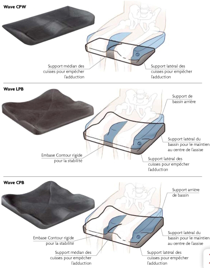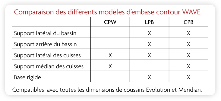 Les coussins EVOLUTION et MERIDIAN peuvent être utilisés avec une embase de positionnement rigide « WAVE » existant en 3 formats : - Biseau contour avant WAVE CPWLes éléments latéraux positionnent les cuisses et empêchent une abduction trop importante. Le support médian détermine l’abduction optimale. Le biseau contour avant WAVE CPW augmente la pression à l’arrière des cuisses, et diminue la pression sous les fessiers. - Embase contour latéral WAVE LPB Cette embase permet un support rigide, offrant un bon positionnement du bassin et des membres inférieurs. Les éléments latéraux arrière, situés derrière les grands trochanters, donnent une stabilité qui permet un maintien du bassin au centre de l’assise. - Embase contour complet WAVE CPB Cette embase combine les avantages du contour latéral LPB, avec une excellente stabilité latérale du bassin, et le maintien du bon degré d’abduction des membres inférieurs.